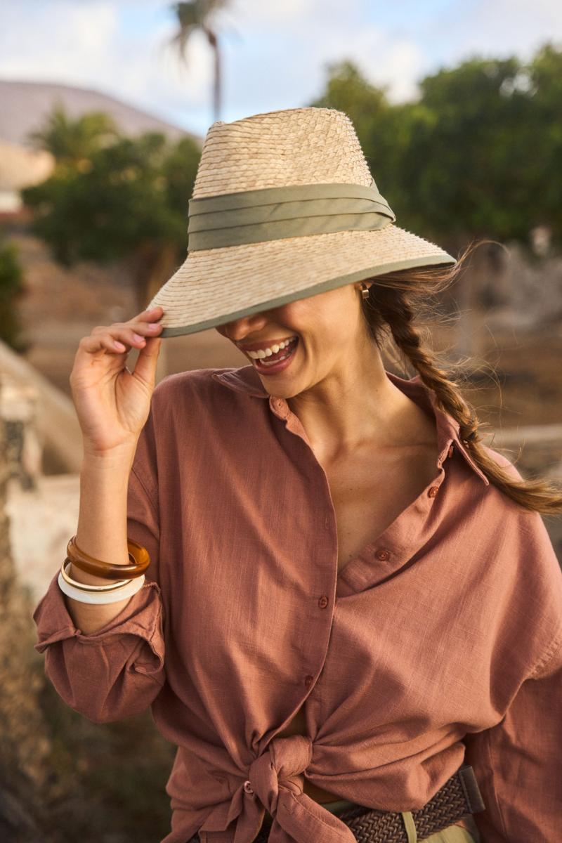 Si votre chapeau a malheureusement été utilisé sous lapluie, nous vous conseillons de retourner la bande de protection interne etd’éloigner le plus possible les parties en cuir du raphia. Séchez-le à l’airlibre et évitez de le poser à plat.